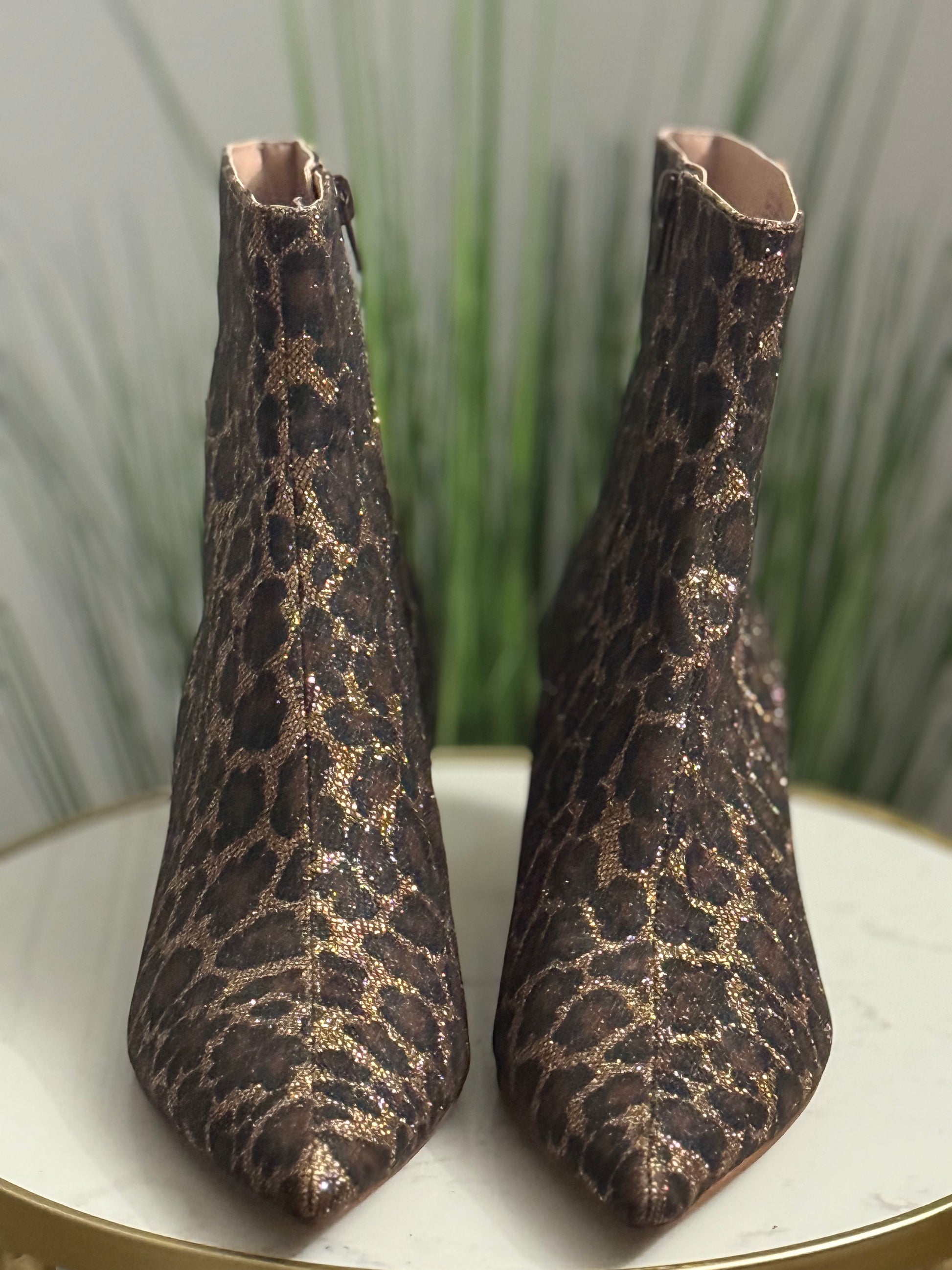 Betsey Johnson Atlass leopard-print kitten-heel booties made with a fabric upper and shimmering gold flecks.